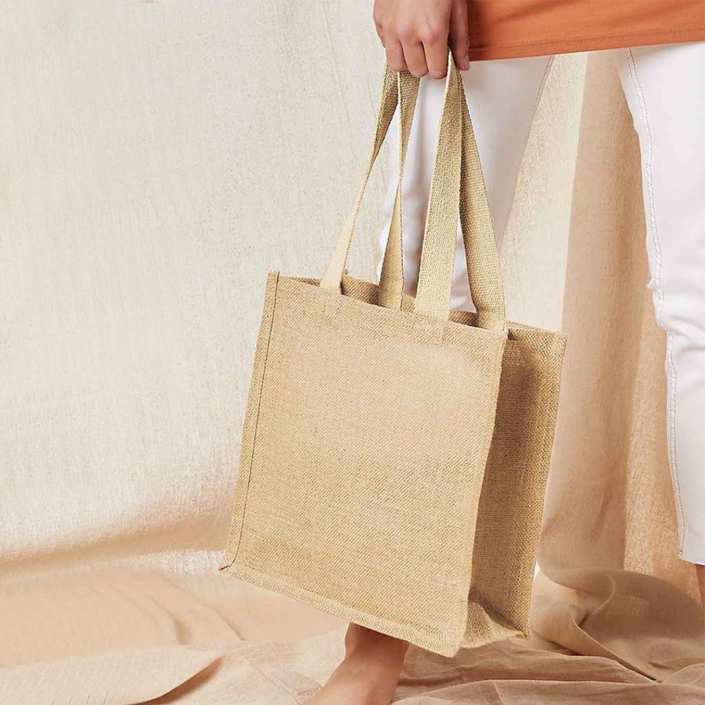 Made from 100% webbed jute material, this casual compact bag features a rough, strong woven texture of high-quality jute, one of the strongest and most sustainable natural fibres. This durable fabric is resistant to scratches and tears, ensuring long-lasting use. With a 12cm gusset along the base and sides, the bag offers a 10L capacity, ideal for daily use. Two long (60cm) webbed cotton handles provide comfortable shoulder or hand carry. Premium jute provides a reliable option for a personalised bag.